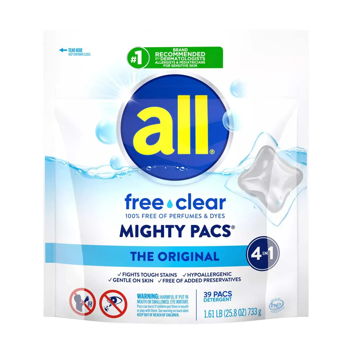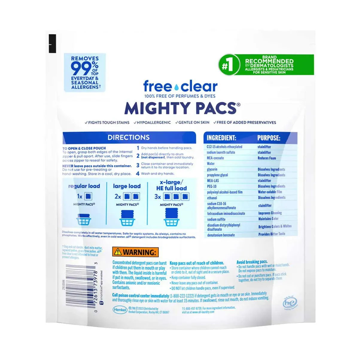All free clear mighty pacs are 100% free of perfumes and dyes with concentrated cleaning power in a convenient pac. all free clear is the #1 recommended detergent brand by dermatologists, allergists and pediatricians for sensitive skin. These hypoallergenic mighty pacs are Tough on Stains, Gentle on Skin. Use with all free clear fabric softener and dryer sheets for clean and soft clothes with static cling reduction in the dryer. All free and clear mighty pacs are unscented, fragrance free, and are safe to use in any washing machine including high efficiency (HE) and they dissolve completely even in cold water. Add pac(s) to washing machine drum before adding clothes. Use 1 pac for small and medium loads or 2 pacs for larger loads then wash as usual. all mighty pacs are safe for septic systems and contain no phosphates. This 4-in-1 detergent pack contains one pouch of 39 all free clear mighty pacs, enough for 39 regular loads of laundry. Unscented, fragrance free, and 100% free of perfumes and dyes with concentrated cleaning power in a convenient pac.