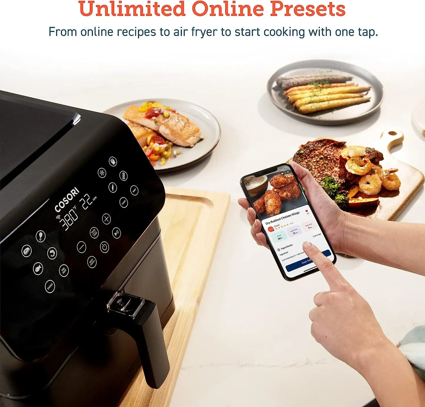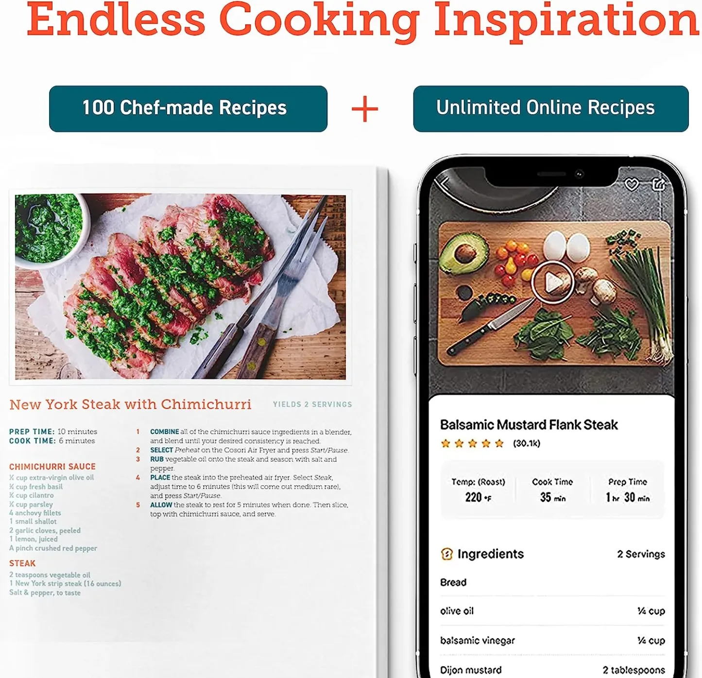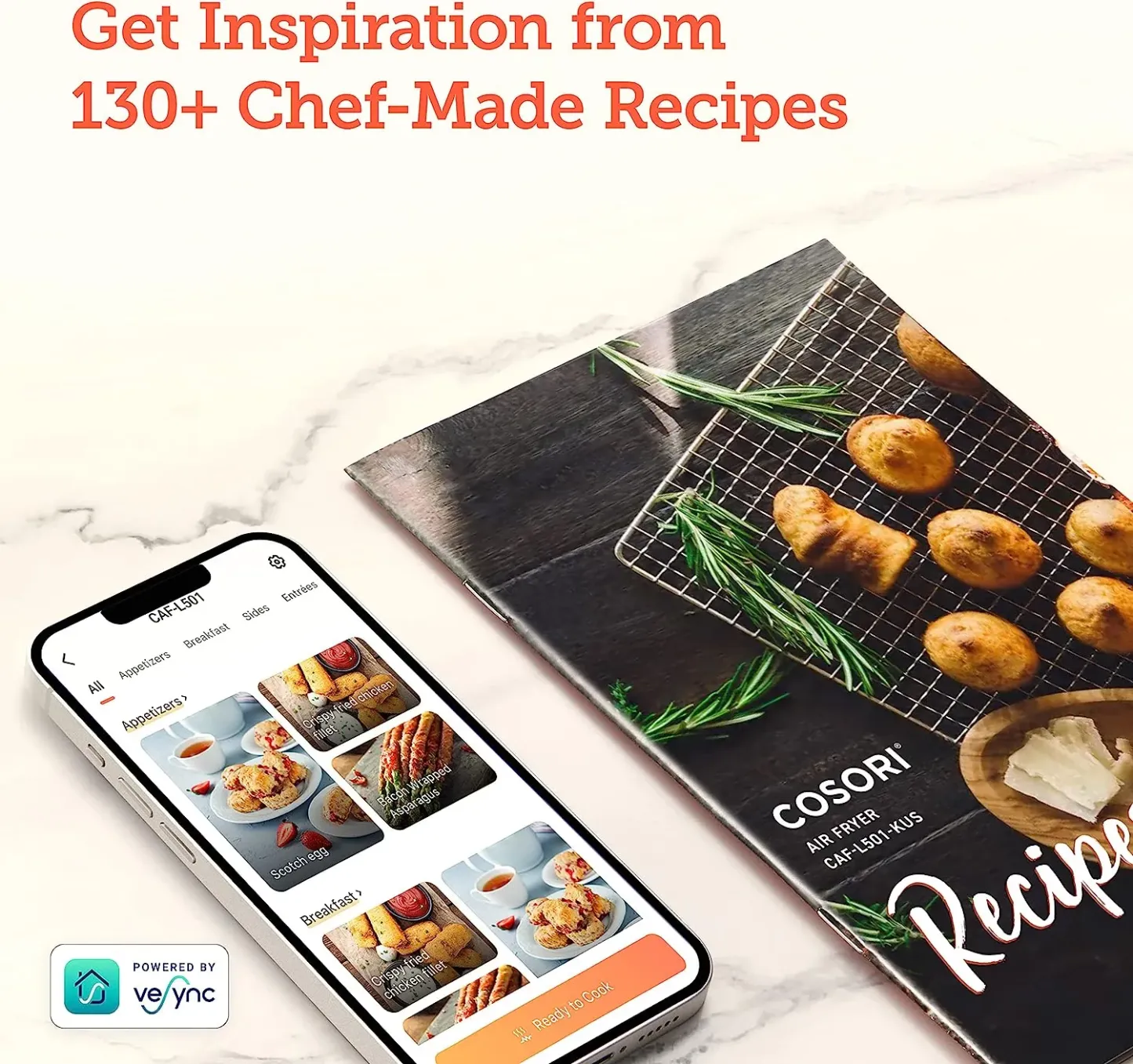 - COOKBOOK & ONLINE RECIPES : Always be inspired to cook with an included cookbook of 30 original recipes by Cosori R&D chefs and 100+ recipes on the free VeSync app. You’ll be cooking like a pro in no time