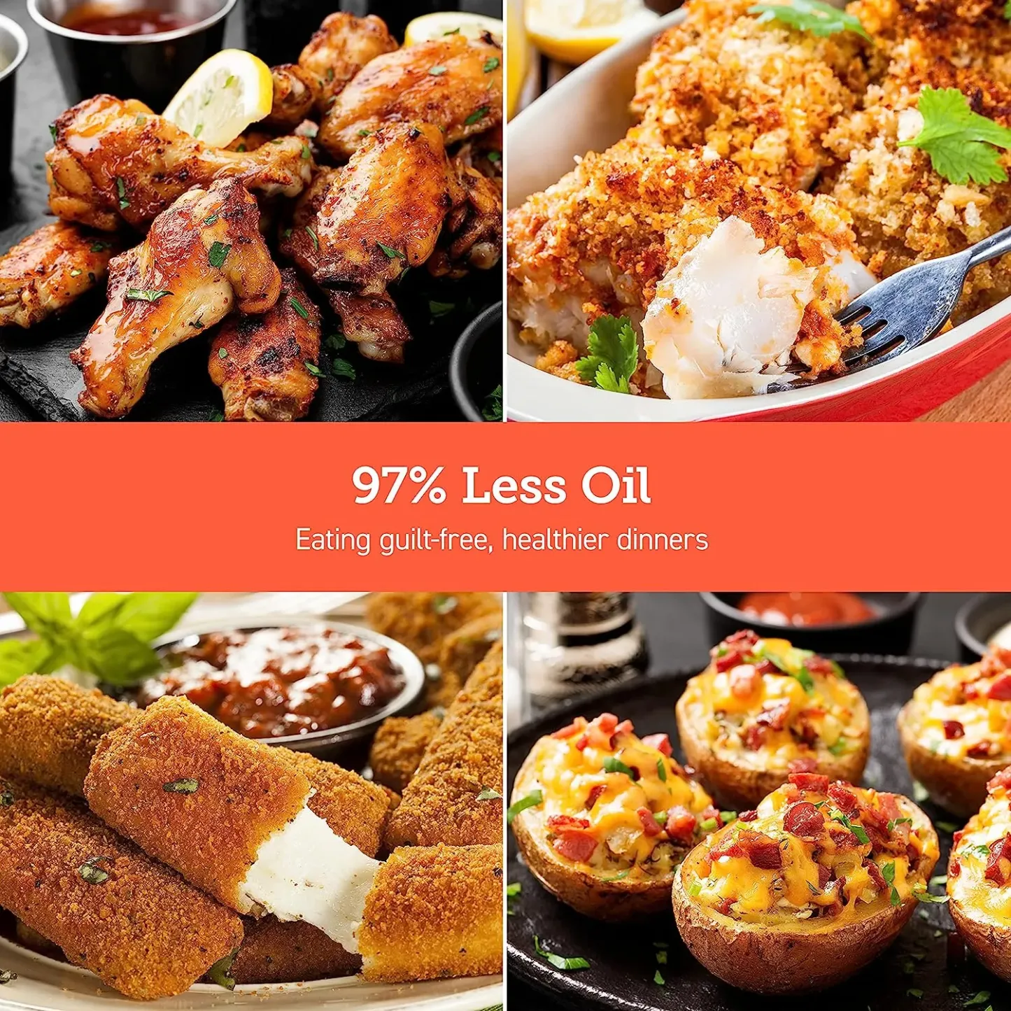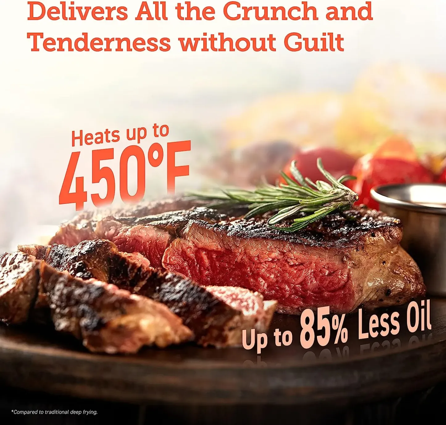 - CUT DOWN 85% OIL :With 360° rapid heat circulation technology, feel free to enjoy the same crispy textures as traditional deep frying with up to 85% less fat