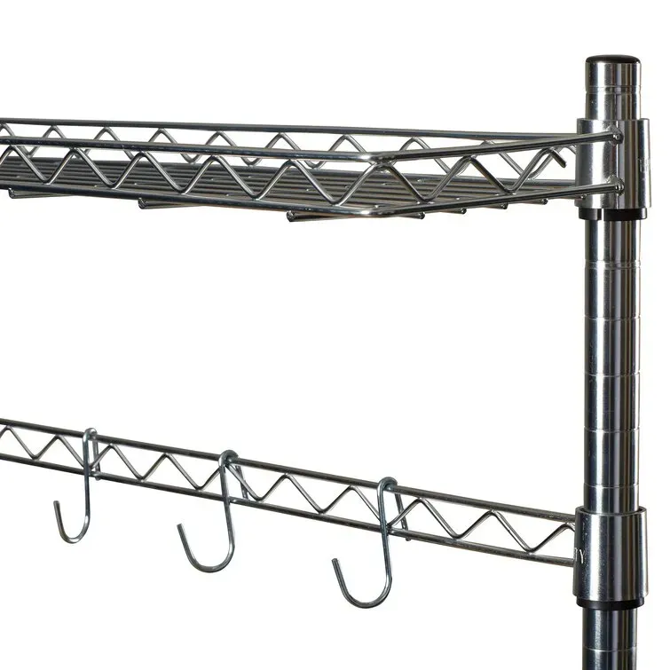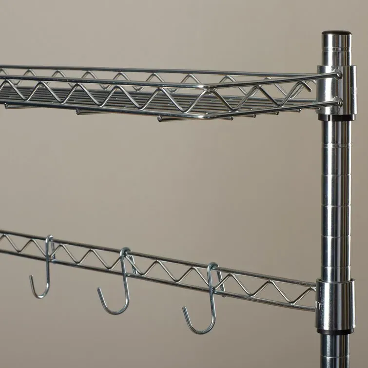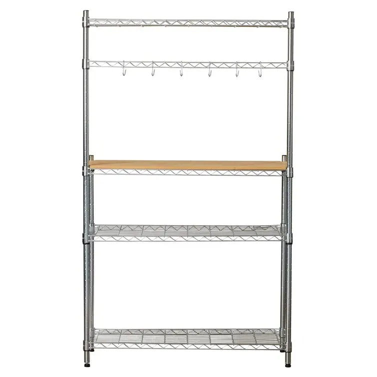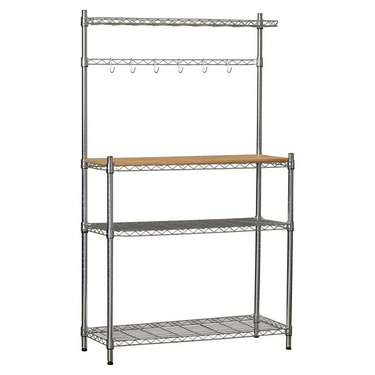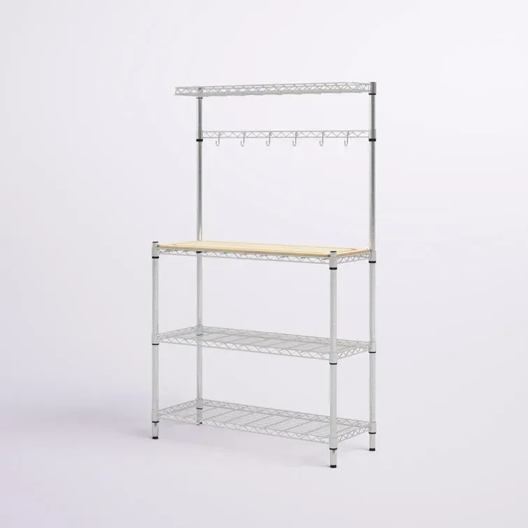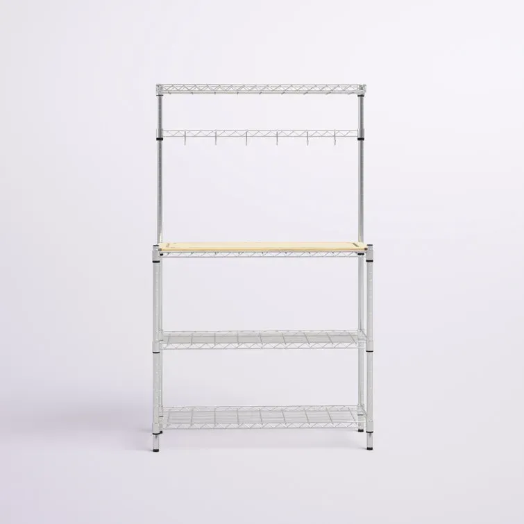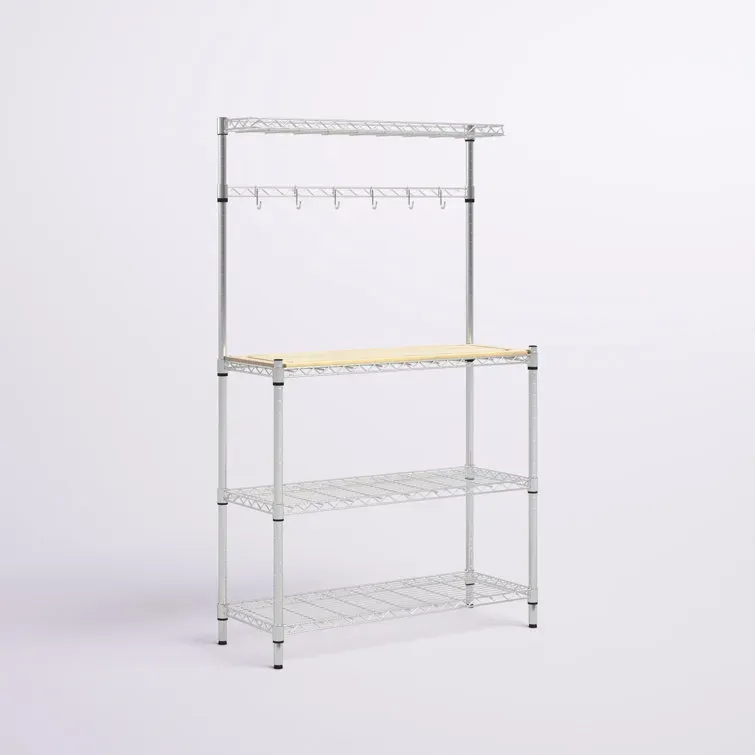 Whether you're a baker or just handy in the kitchen, this baker's rack is sure to bring you storage and utility in the kitchen! Crafted from metal, it features a solid bamboo top that provides a sturdy working surface, which is removable for easy cleaning (or to use throughout your home). Three shelves help you store everything from flour to mixing bowls, while the included hooks are ideal for cutting boards or pots and pans.
