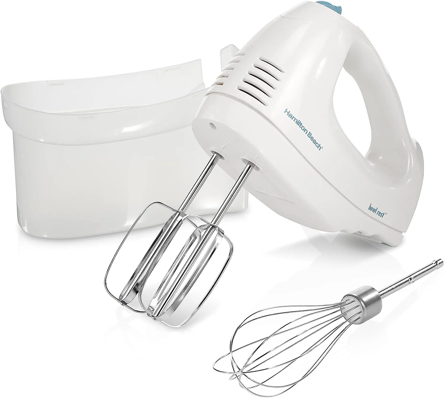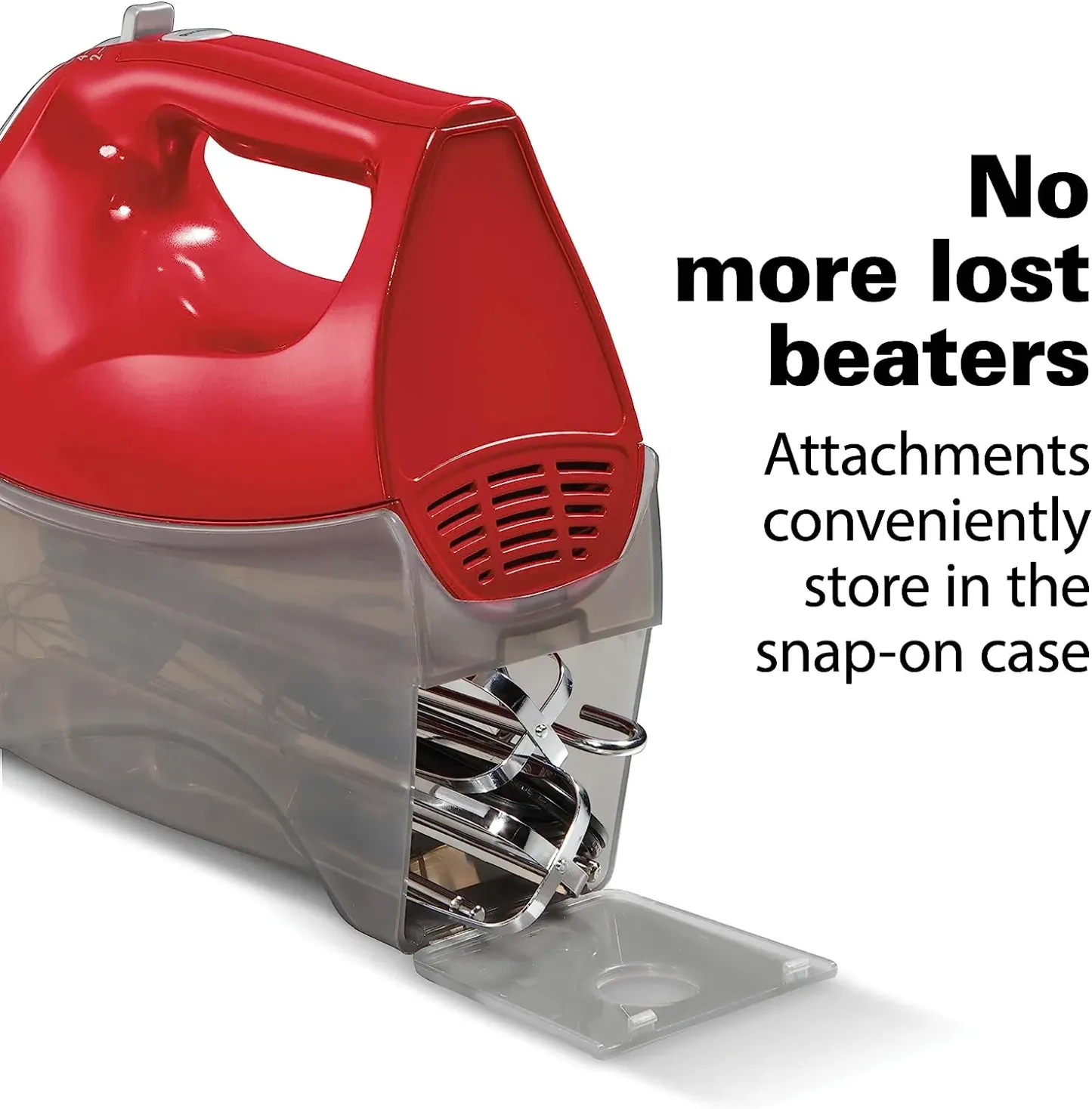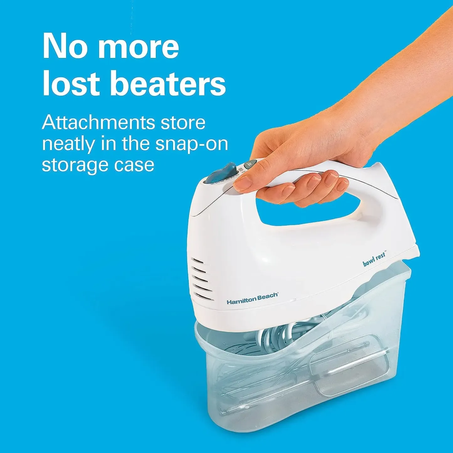 - No more lost beaters. The storage case easily snaps onto the hand mixer. The case holds the included attachments to prevent lost beaters and reduce kitchen clutter.