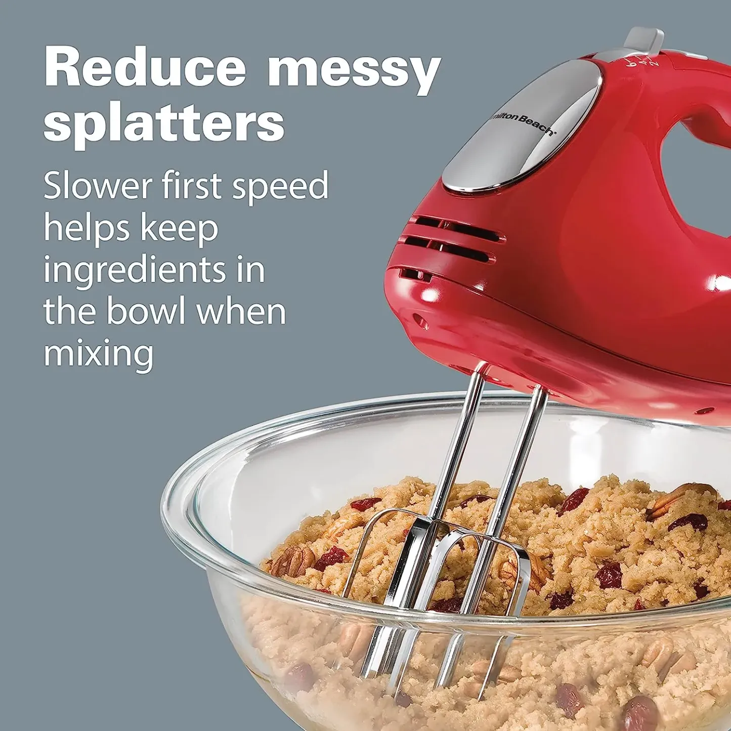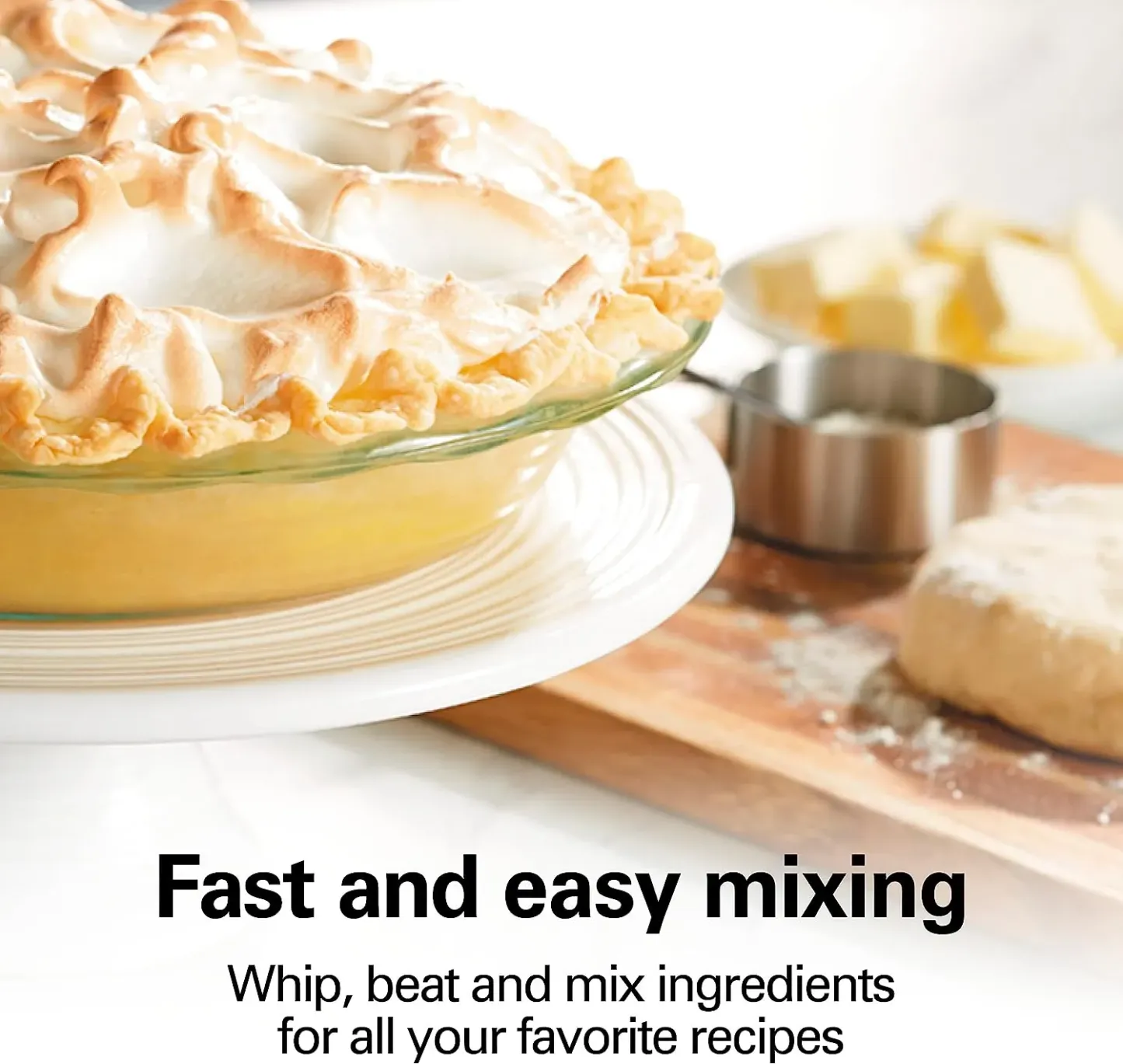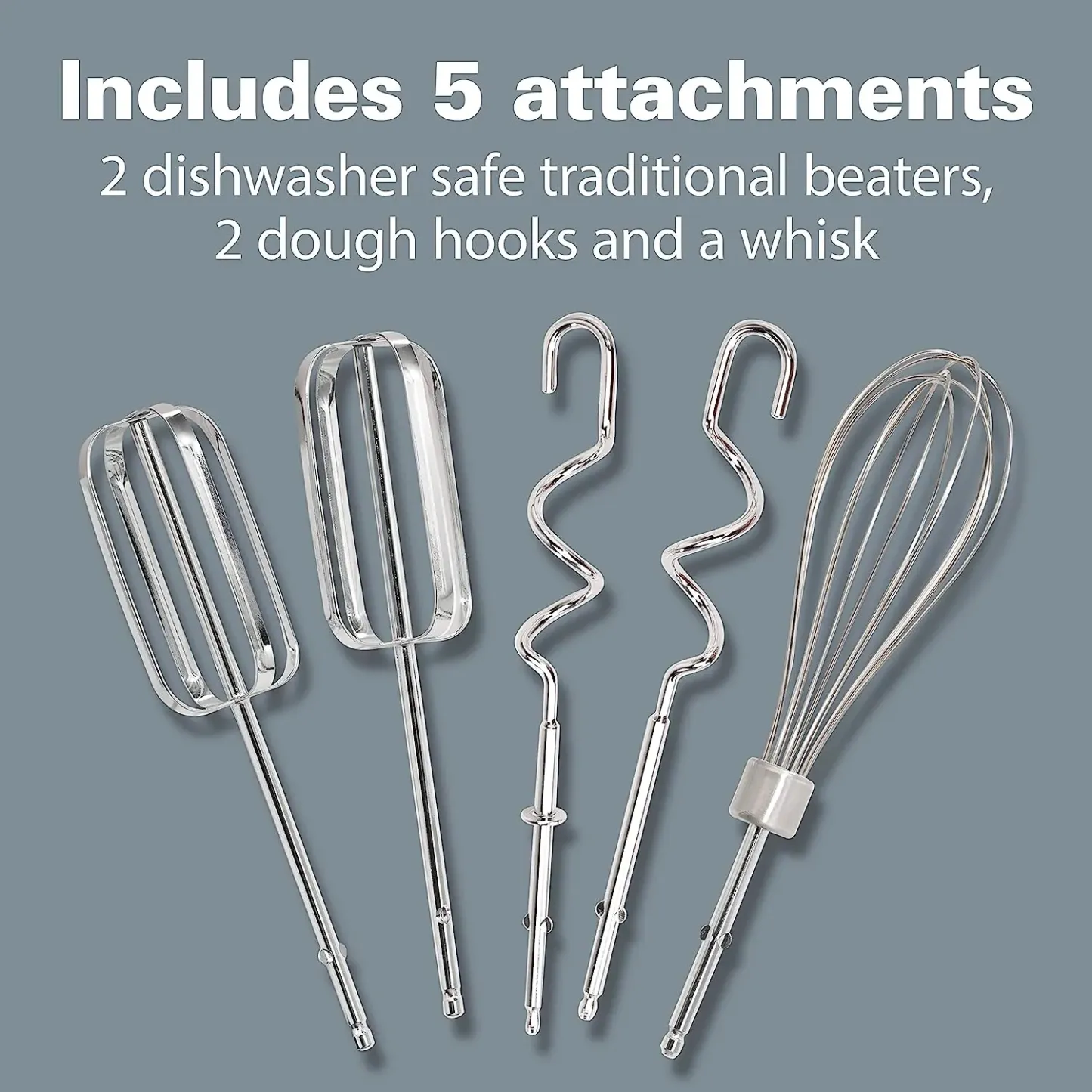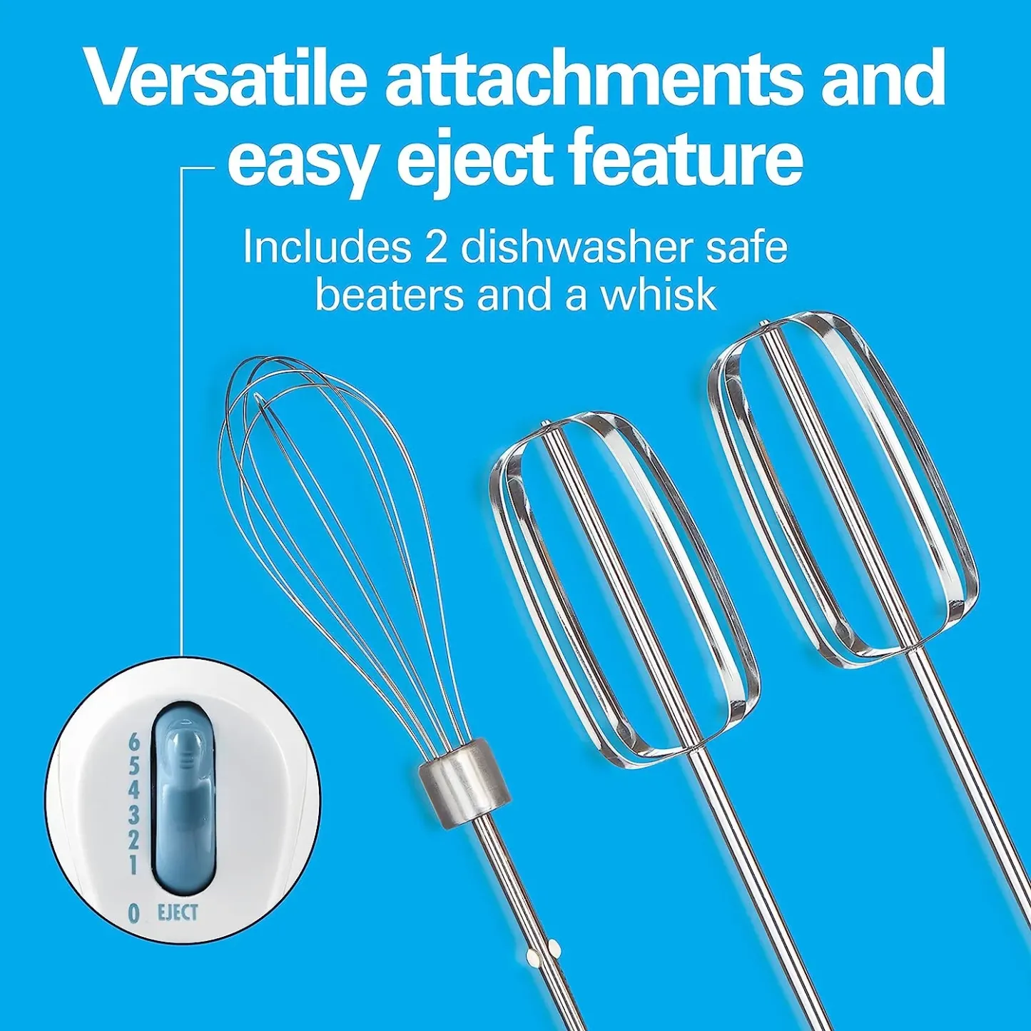 - Versitile attachments and easy eject feature. The hand mixer comes with 2 traditional beaters and a whisk. Simply press the speed dial to release the dishwasher safe attachments for fast cleanup without getting your hands messy.