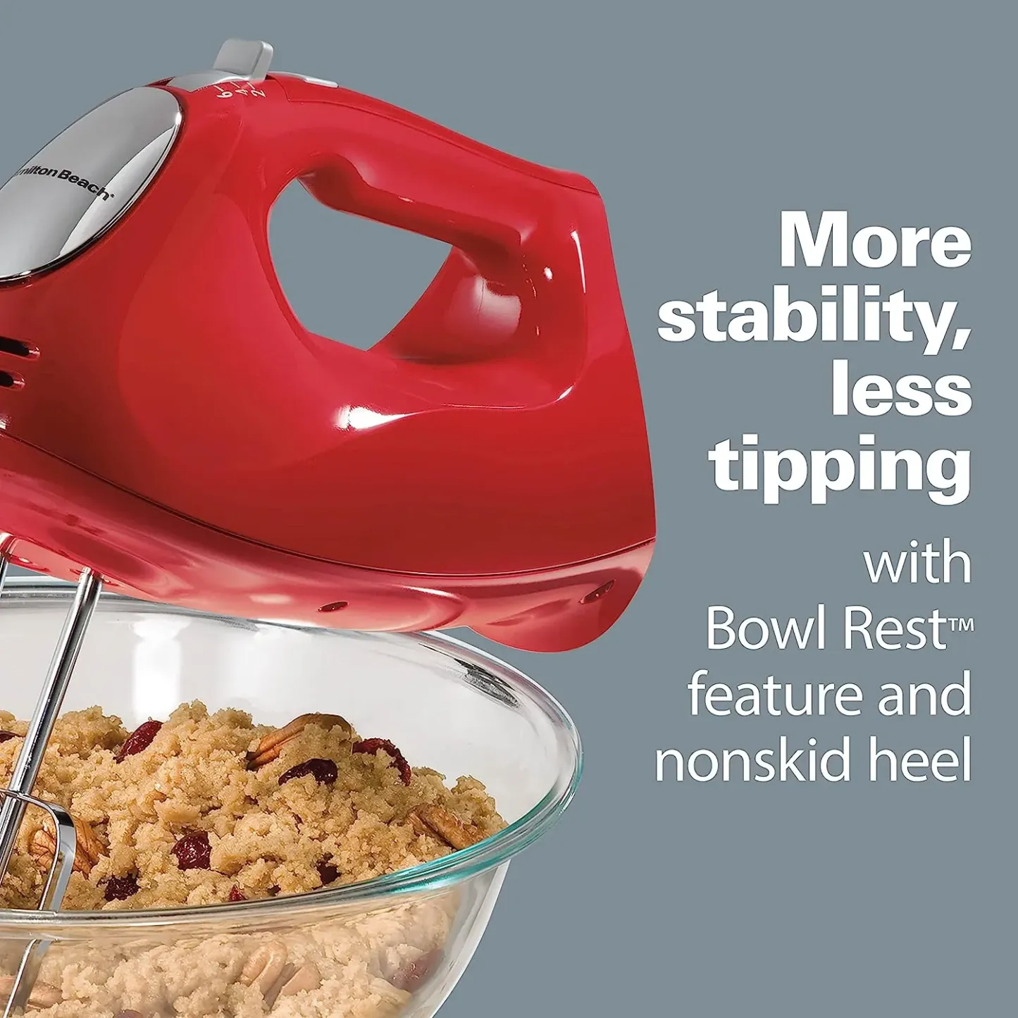 - 6 speeds with QuickBurst button. This versatile hand mixer has 6 different speed options, plus a QuickBurst button for an extra burst of power when you need it. It easily handles a variety of ingredient, from nuts to dry flour and creamy butter. Rest stabilizer Six speeds with Quick
