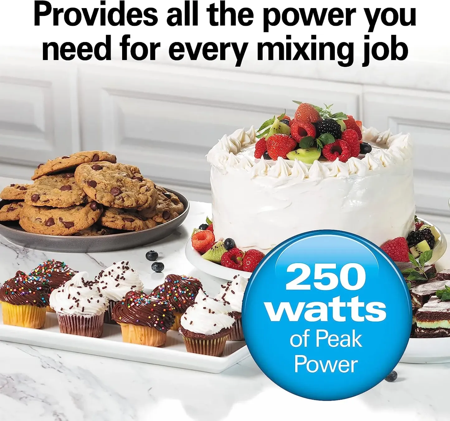 - 250 watts of peak power. This Hamilton Beach hand mixer provides all the power you need for every mixing job, whether you're adding nuts and chocolate chips to cookie dough or making fluffy whipped cream.