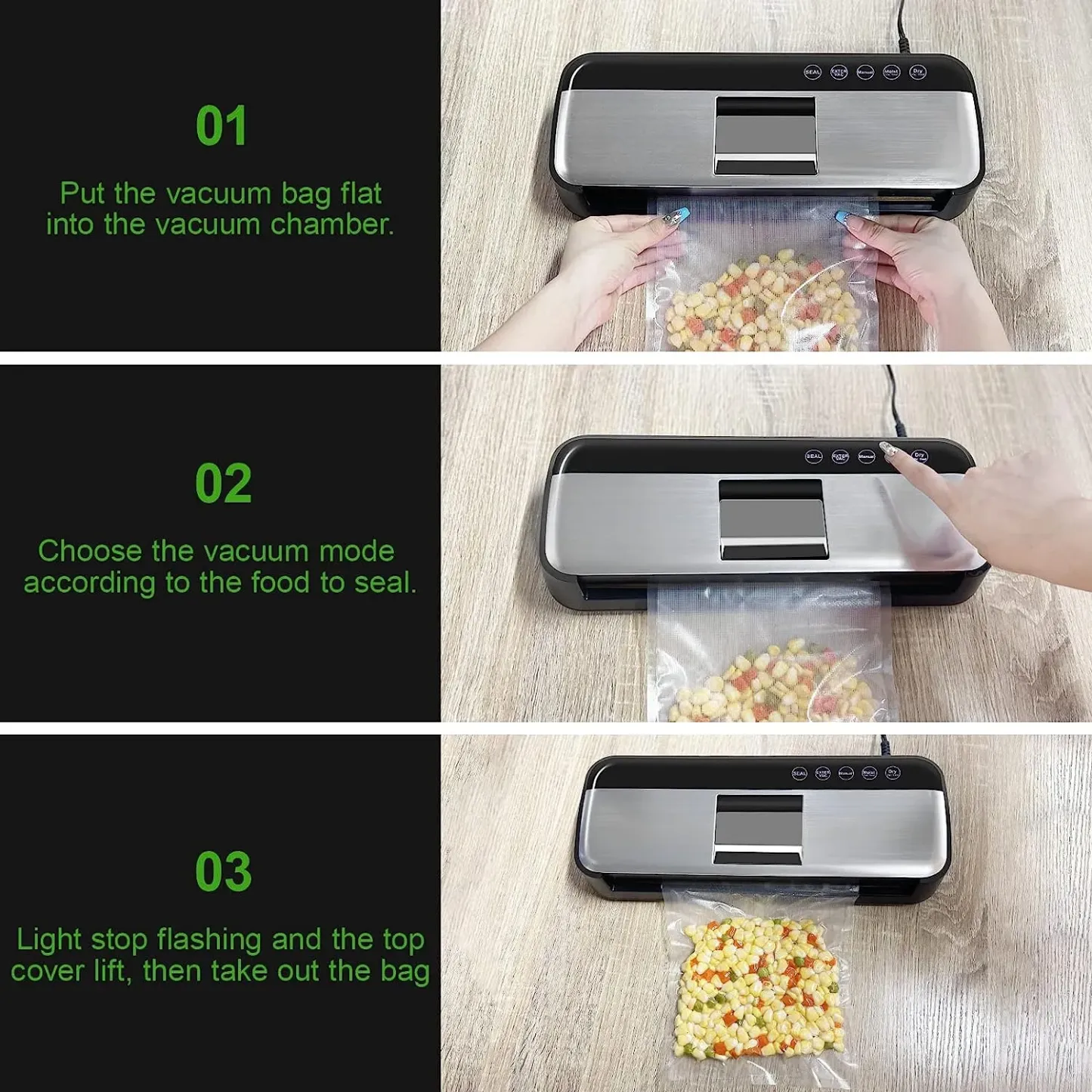 - [ONE-TOUCH OPERATION]: Just insert, touch and done! Our seal a meal vacuum sealer machine adopts fully automatic one-touch operation, with no need to press. Simply plug it in and insert the bag into the vacuum sealer, then choose the mode you need. Wait a few seconds and the vacuum is done when the indicator light stops flashing and the cover lifts up again.