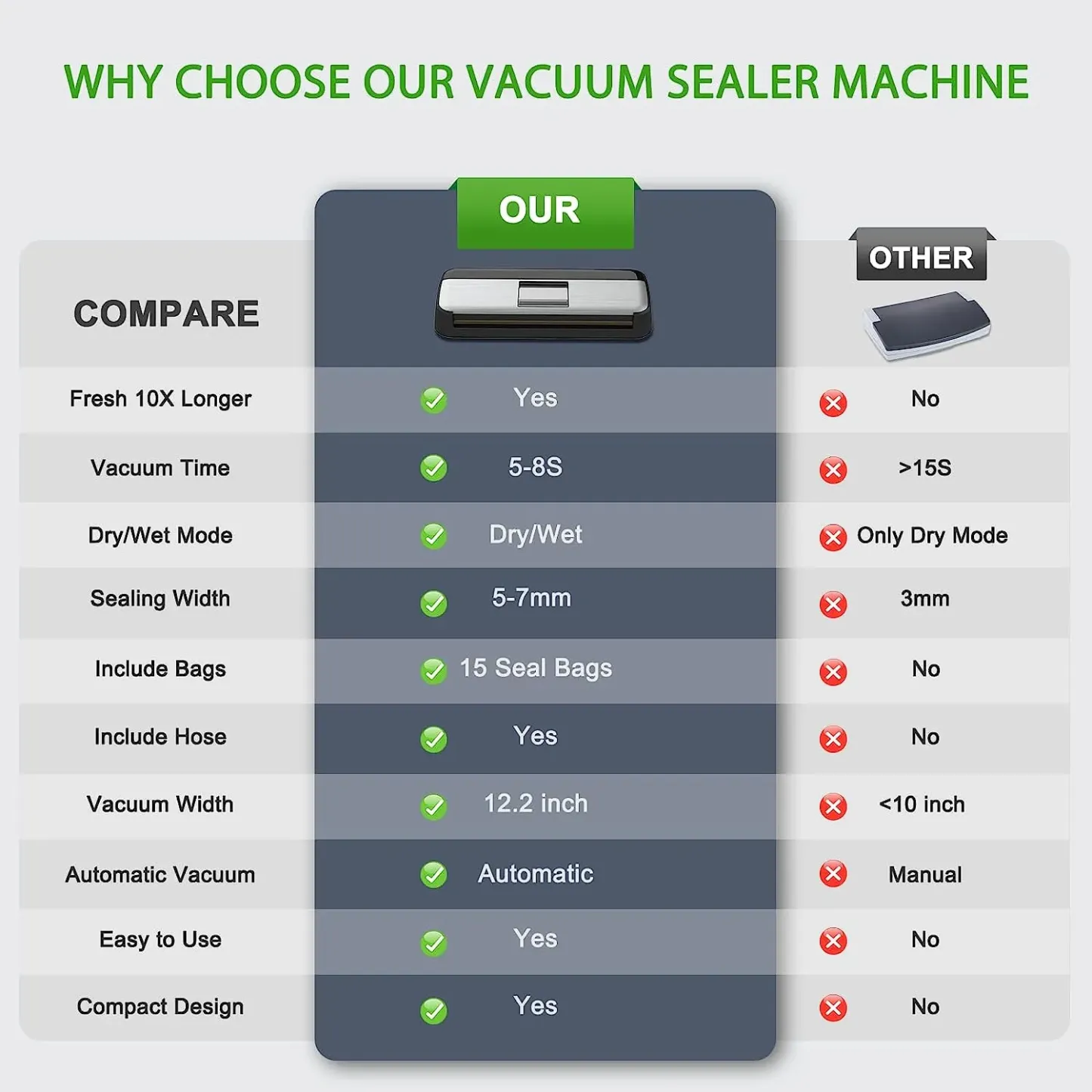 - [DYNAMIC SEALING WIDTH FOR AIRTIGHT SEALING]: The 12.2 inches sealing wire supports to seal 3-5 small vacuum bags at once. Our vacuum machine features advanced heating wire with a dynamic sealing width of 5mm for dry mode and 7mm for moist mode, giving you the best sealing results.
