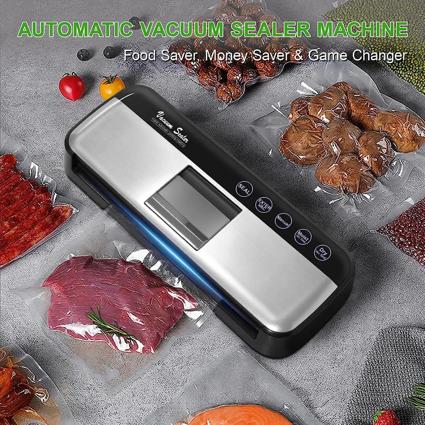 - [FIVE SEAL & VACUUM FUNCTION FOR MOIST/DRY FOOD]: The food vacuum sealer machine offers five modes - Seal/Exter VAC/Manual/Dry/Moist - to meet your needs for different types of food from solid food to wet items. With the manual modes, you can control the vacuum level to prevent crunchy food from getting squished. Food sealer vacuum sealers give your food the most careful protection.