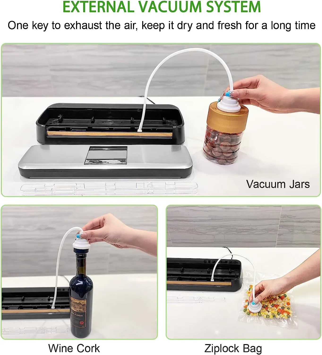 - [EASY TO CLEAN]: Our vacuum sealer machine is designed with a removable water receiving box in front of the heating wire, which collects any excess liquids and debris during operation, effectively preventing liquids from entering the mason jar vacuum sealer, so keep countertops clean and make it easy to clean.