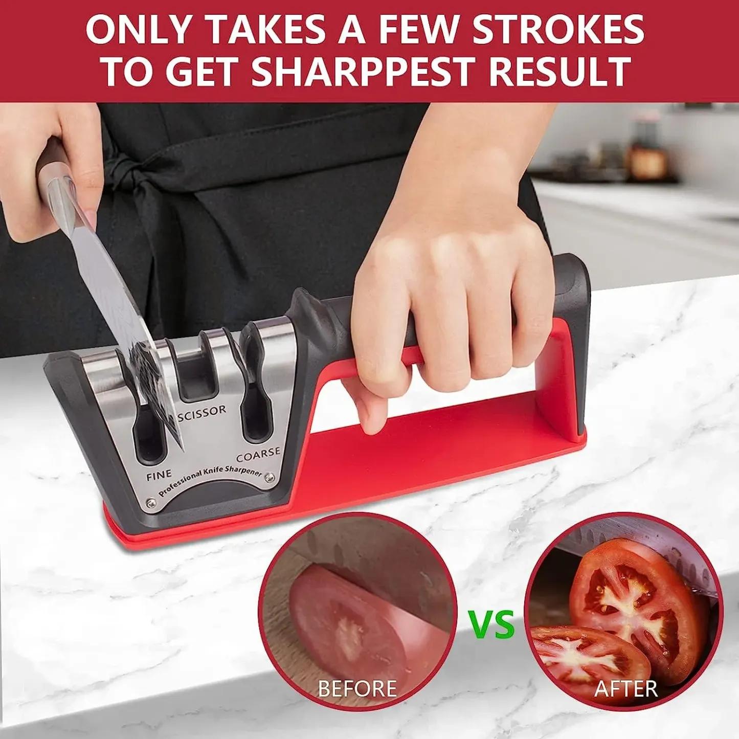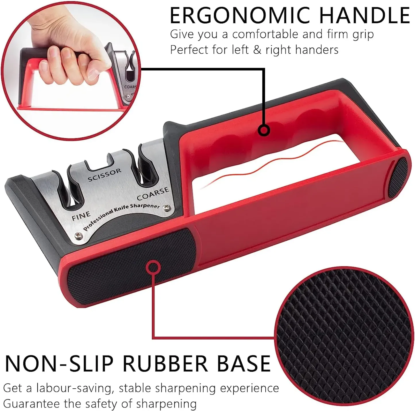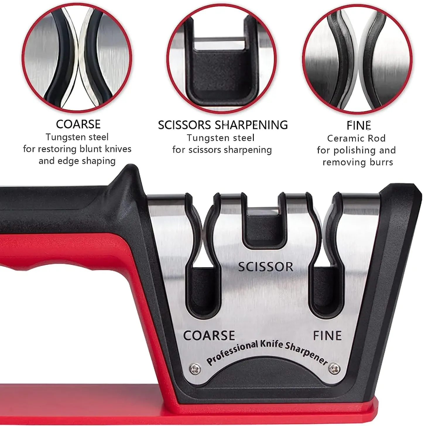 - [3 SHARPENING OPTIONS] The knife sharpeners for kitchen knives comes with 3 grooves helps to restore the blunt knives with different varying degrees of blade wear. Choose from the coarse, fine and scissors slots to repair and return the dull blades back to the factory sharpness in a few simple strokes.