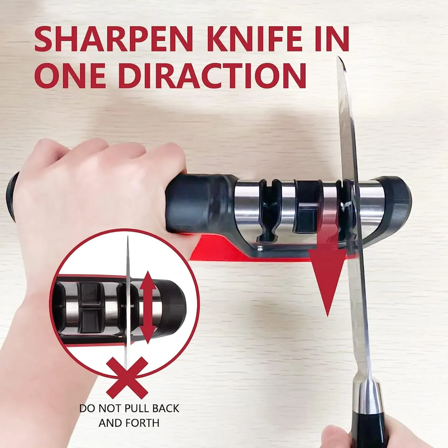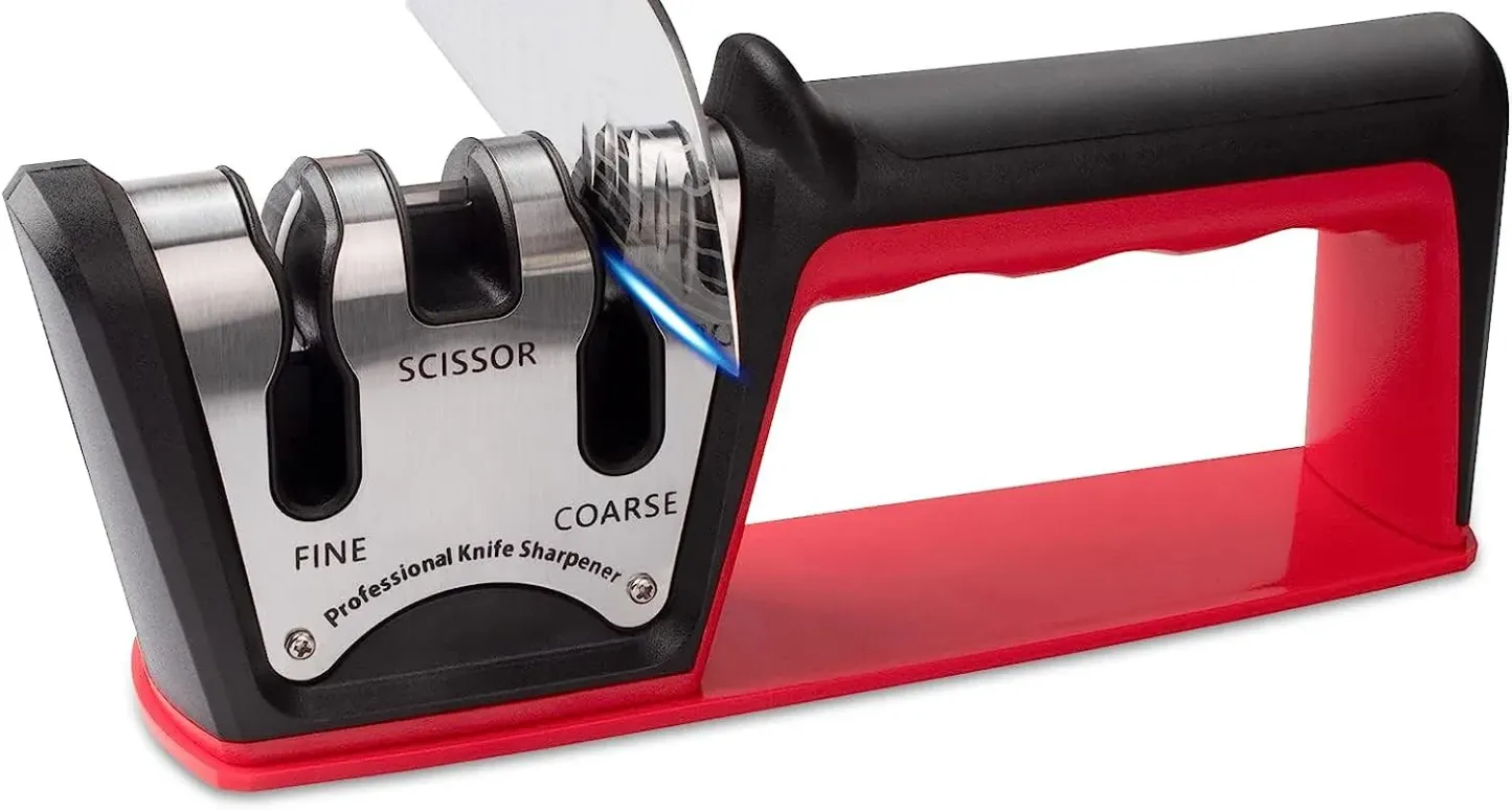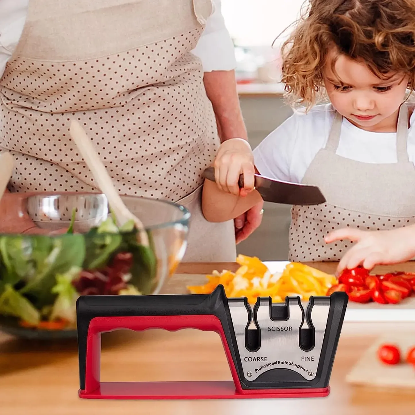- [3 SHARPENING OPTIONS] The knife sharpeners for kitchen knives comes with 3 grooves helps to restore the blunt knives with different varying degrees of blade wear. Choose from the coarse, fine and scissors slots to repair and return the dull blades back to the factory sharpness in a few simple strokes.