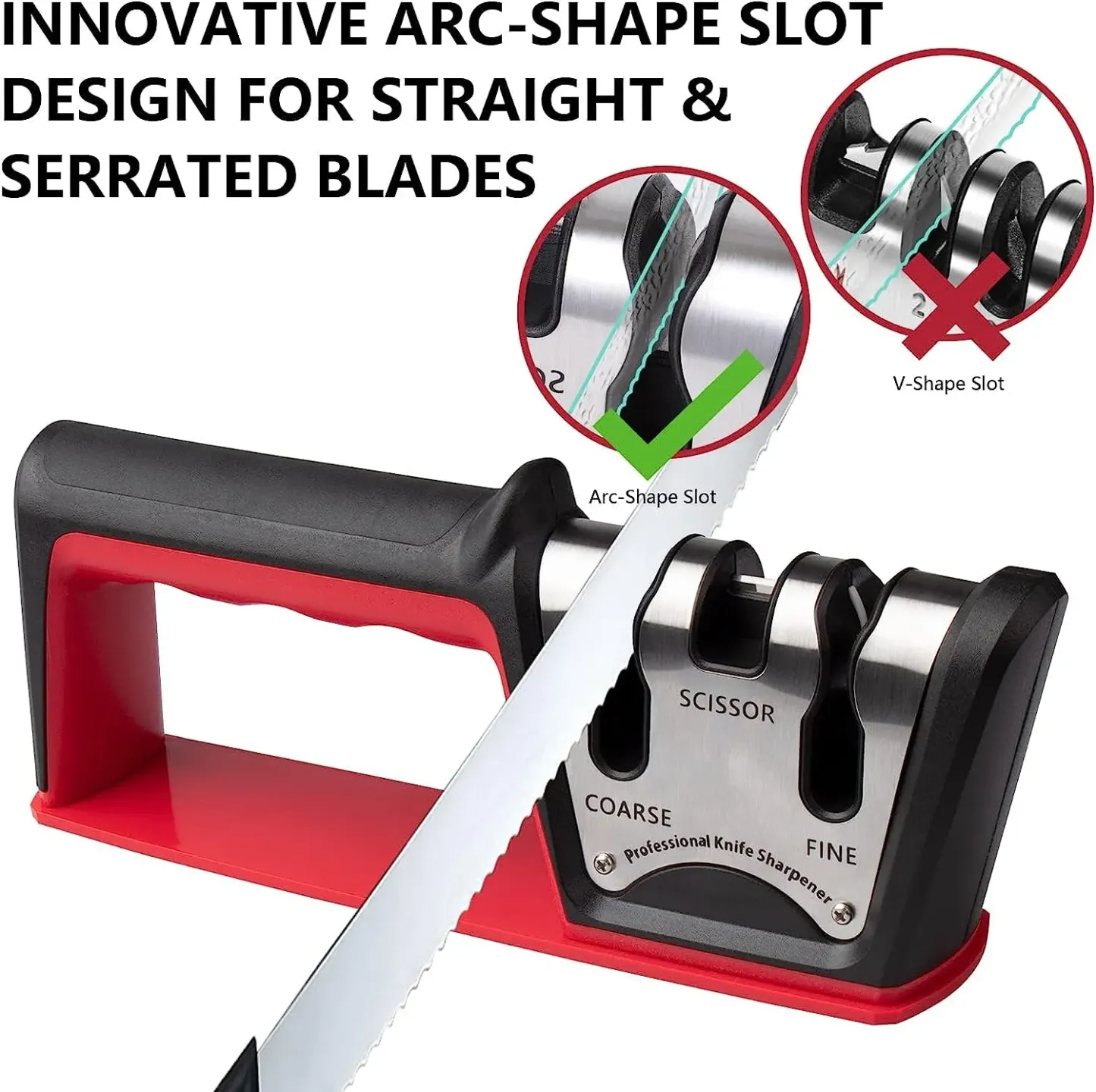 - [UPGRADED ARC-SHAPE SLOT DESIGN] Our professional knife sharpeners features an innovative arc-shape slot design that ensures a perfect fit for both serrated and smooth blades, greatly improving sharpening effectiveness. Suitable for both smooth & serrated blades, including chef's knives, bread knives, pocket knives, hunting knives or scissors.