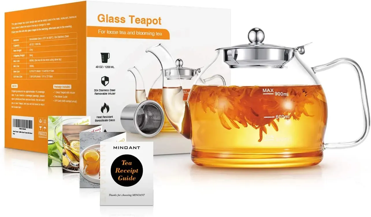 • MINO ANT Tea Set – 1200ml Glass Teapot with Removable Stainless Steel Infuser, and 4 Glass Teacups, Stovetop Safe Tea Kettle Gift Set, Blooming and Loose Leaf Tea Maker Set