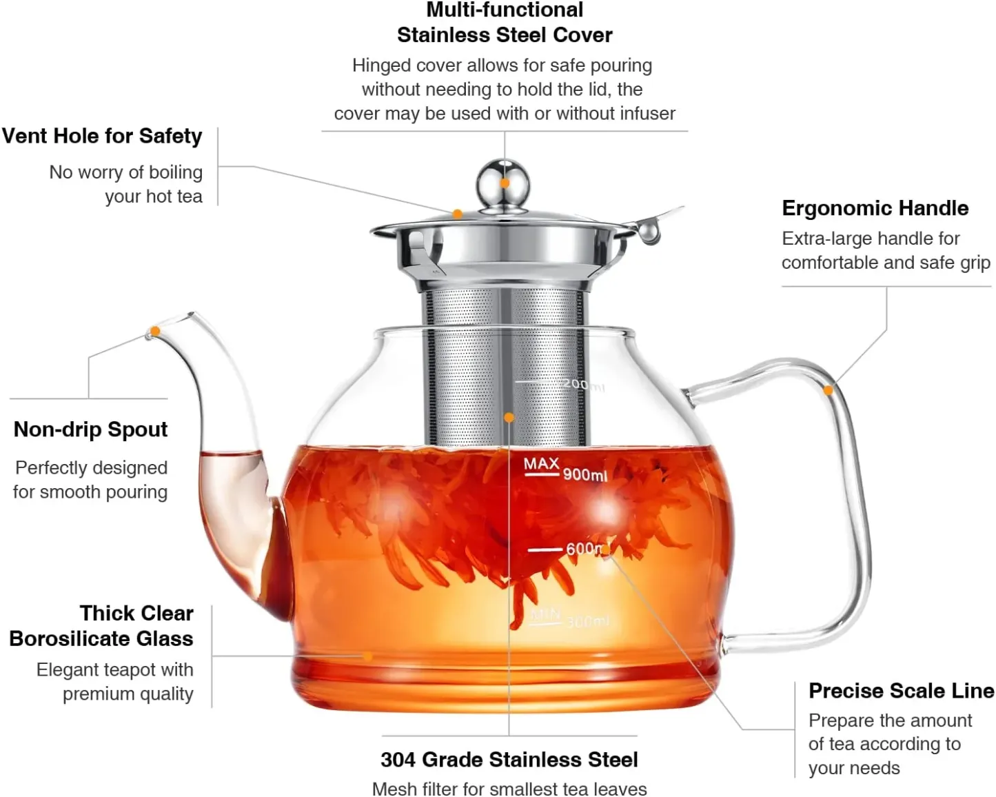 • 💖️Perfect Design: Our glass teapot is professionally designed with a non-dripping spout and perfect ergonomic handle for a sturdy grip, and feels in hand. The exact scale line helps you make precisely the right amount of water to meet your needs. The tea pot has a 40oz large capacity, Which is enough for everyday use or party serving.