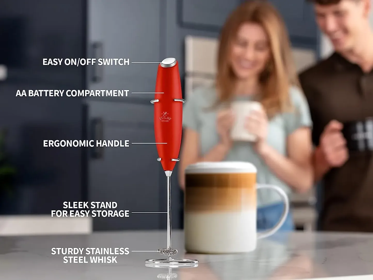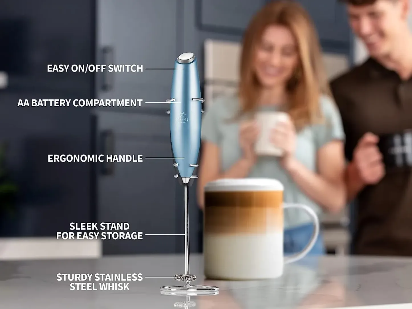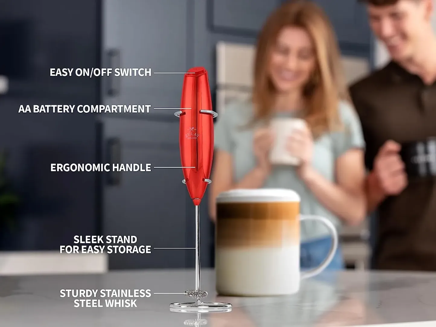 - EASY TO CLEAN AND STORE: The durable convenient metal stand gives easy access for foamy goodness in seconds. Cleanup for this matcha wisk & frother is even faster. To clean just put the whisk in hot running water and briefly turn it on – instantly clean! When stored on counter or table it sits nicely next other coffee accessories. Our powerful and durable hand-held milk frother is powered by two AA batteries (not included) with a compact electric design that easily fits in a drawer.