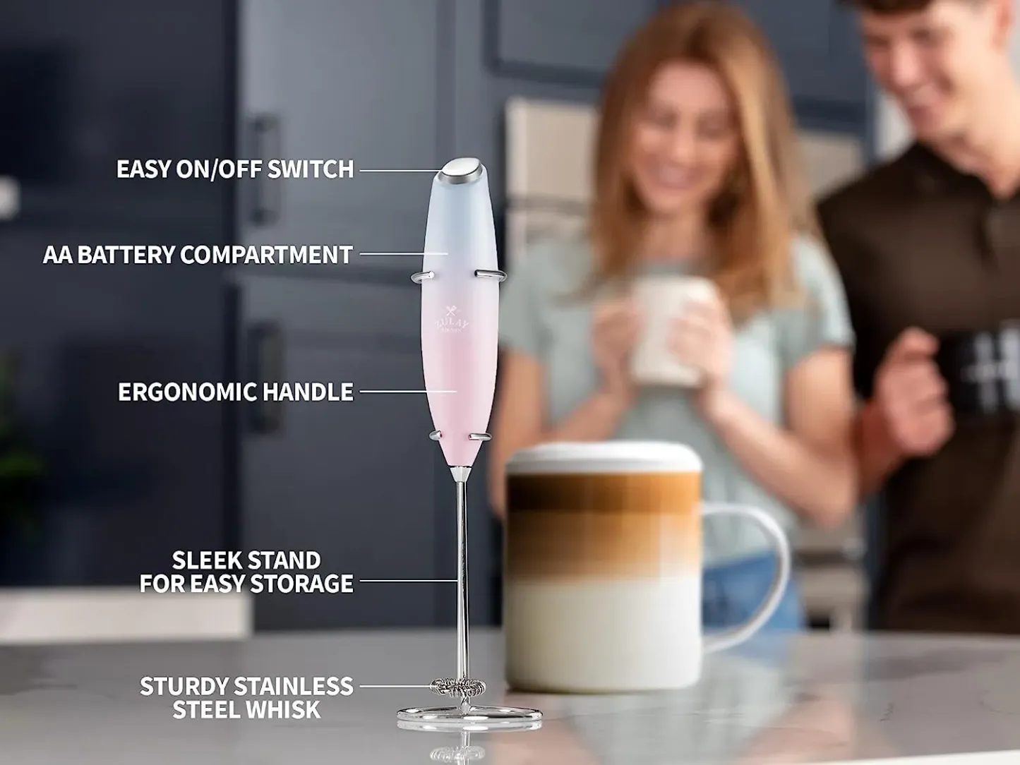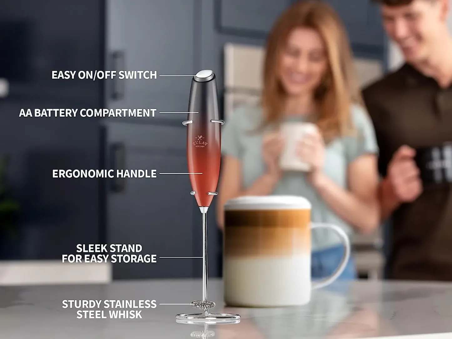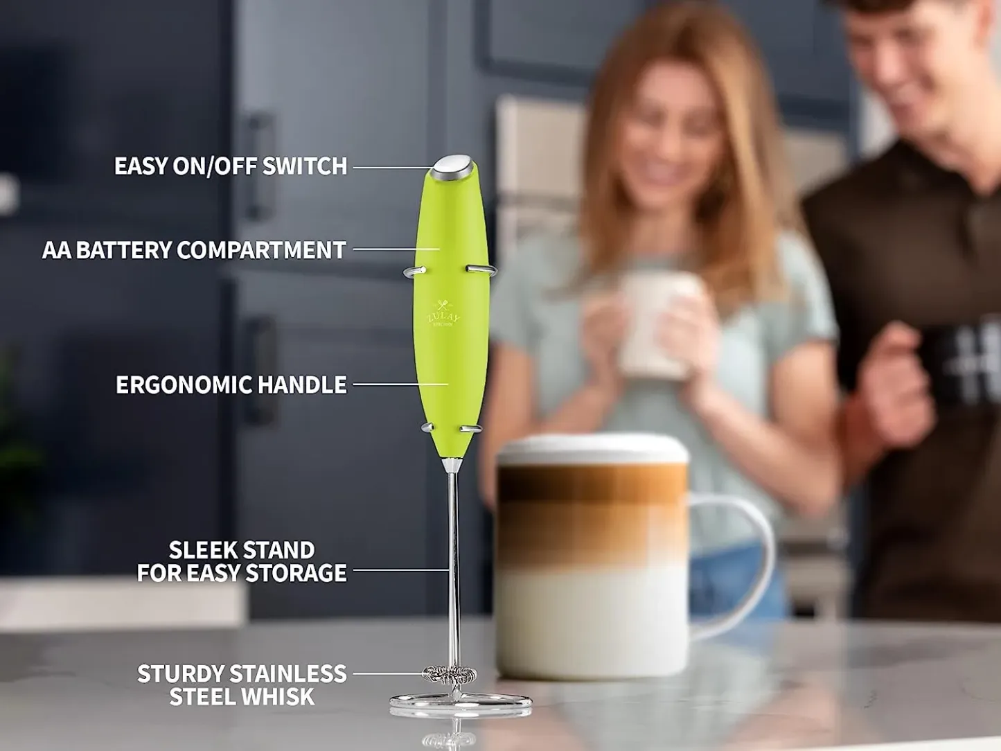 - EASY TO CLEAN AND STORE: The durable convenient metal stand gives easy access for foamy goodness in seconds. Cleanup for this matcha wisk & frother is even faster. To clean just put the whisk in hot running water and briefly turn it on – instantly clean! When stored on counter or table it sits nicely next other coffee accessories. Our powerful and durable hand-held milk frother is powered by two AA batteries (not included) with a compact electric design that easily fits in a drawer.