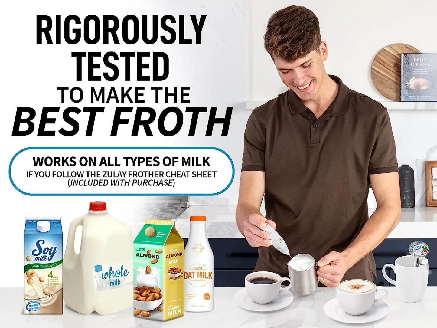 - PROVEN AND TRUSTED QUALITY: We use only premium materials. The construction will last, backed by our Zulay Guarantee to not rust or break, ever. Our small and efficient frother works on all types of milk - half and half, creamer, soy, almond, cashew, hazelnut, whole milk, and other dairy such as butter or cream.