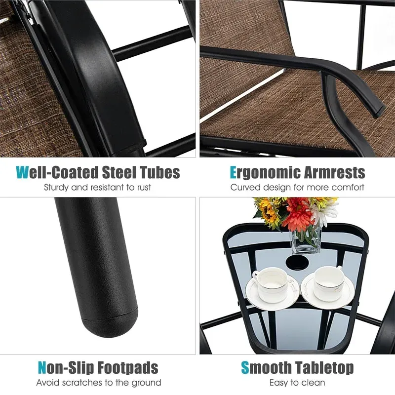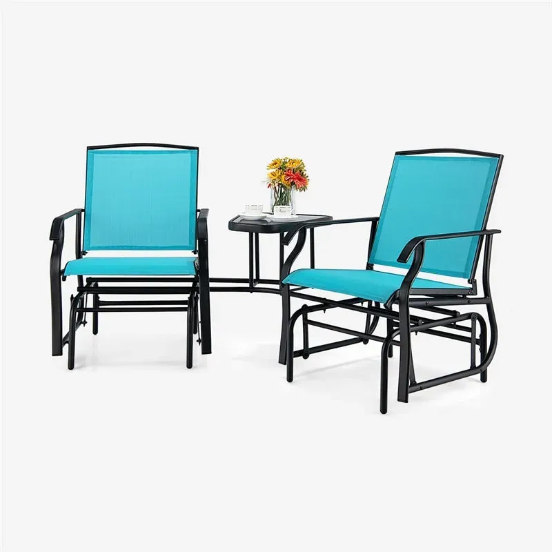 This patio double swing glider chair table set is perfect for a variety of outdoor places like the backyard, poolside, deck, and garden. You could be fully relaxed with this outdoor swing glider chair after long-time work thanks to its ergonomically designed seat and smooth glide motion that would drive away your fatigue and stress. And the 2-seat design allows you to enjoy a good time with best friends or family members. Besides that, the center table with an umbrella hole can supply you with many conveniences. You can put snacks, drinks, magazines and any other small items on it. And the umbrella hole matches most outdoor umbrellas. Meanwhile, its smooth glass tabletop enables daily maintenance quite simple. All in all, this 2-seat swing glider chair will offer you a comfortable relaxing experience outdoors.
