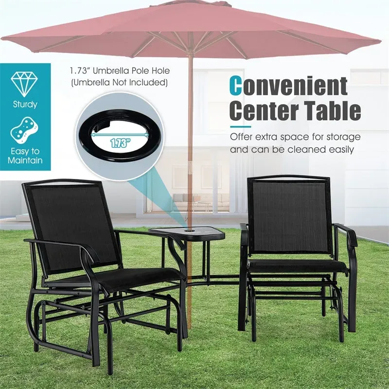 - Practical Table & Umbrella Hole: This double glider chair for the outside also comes with a convenient tempered glass table in the middle, which is perfect to put some small daily items and easy to clean. Apart from that, the 1.73' umbrella pole hole on the table makes it suitable for most standard patio umbrellas (umbrella not included).