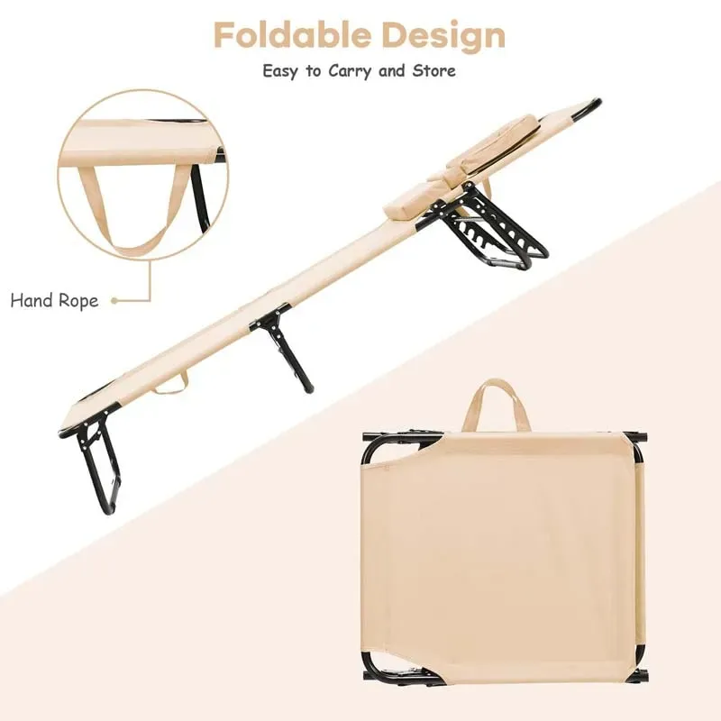This multifunctional outdoor beach lounge chair is a perfect addition to your outdoor environment. Made of solid iron pipe, this lounge bed can ensure high stability and durability. Plus, it features different lay and flat positions to act as 3 furniture pieces in 1, allowing you to lie, lean, or sit on it. Thick sponge-padded cushions and removable pillows can offer great comfort and relaxation for your body.