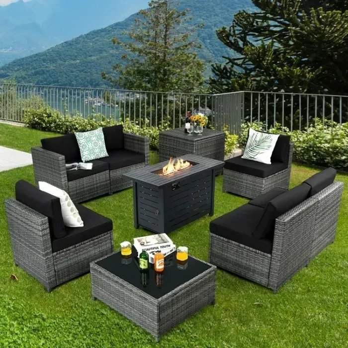 Our rattan sofa set with a 60,000 BTU fire pit is suitable for both indoor and outdoor use. Rattan design is stylish to be a great decoration in your garden or yard. At the same time, it's easy to clean and needs no special maintenance. The steel frame is durable and sturdy enough to have 2240 lbs load-bearing capacity in total. This sofa set comes with a storage box and a coffee table to store and place items. The matching cushions are soft and comfortable. With detachable covers, it's convenient to clean. Besides, sofas can be combined in different ways according to your idea. The outdoor fire table is made of sturdy steel material for durability and stability. Coming with a waterproof PVC cover, the table surface will not easy to be damaged and can stand the test of time. And complete with a high-efficiency burner, you can enjoy all the pleasures of a warm fire without worrying about messy ashes. You can have a party or gather with family members even on cold winter evenings. There is a total of 5 boxes and normally the boxes will arrive on different days. If you want to know more information about the package, please contact us.